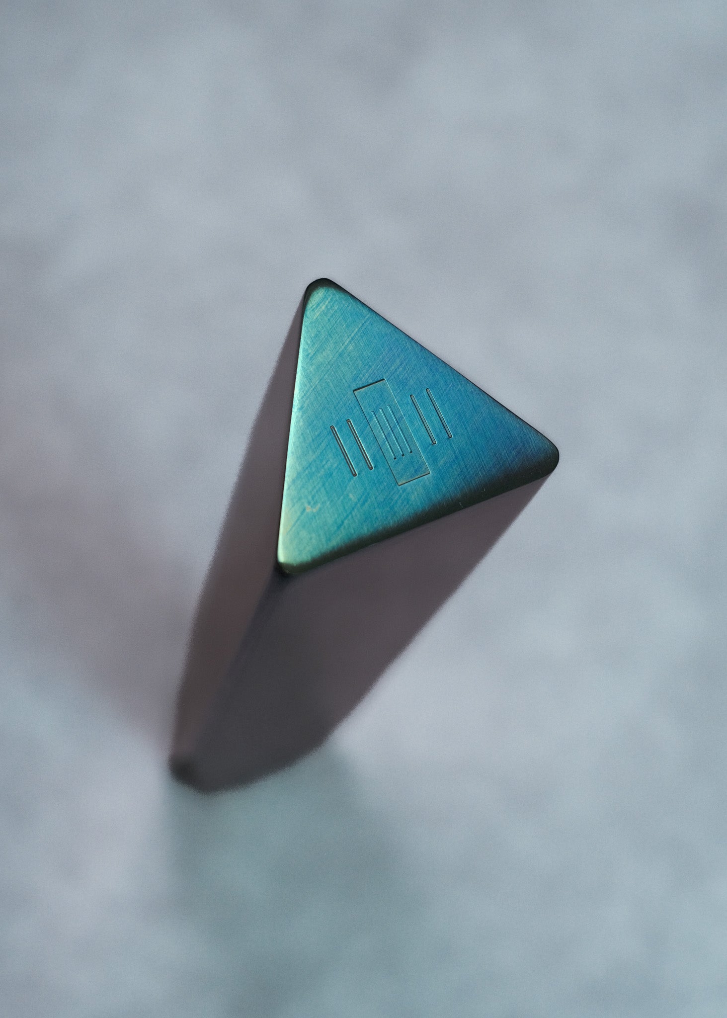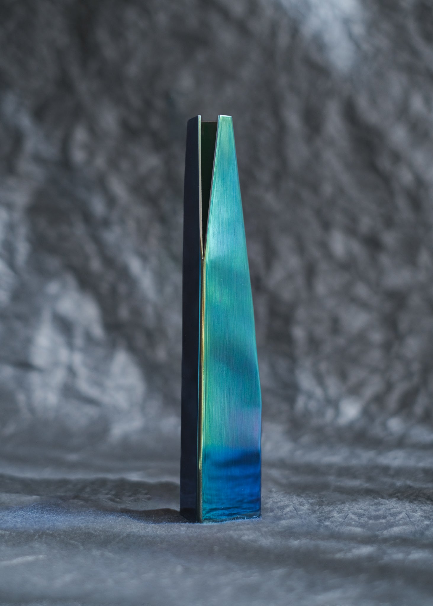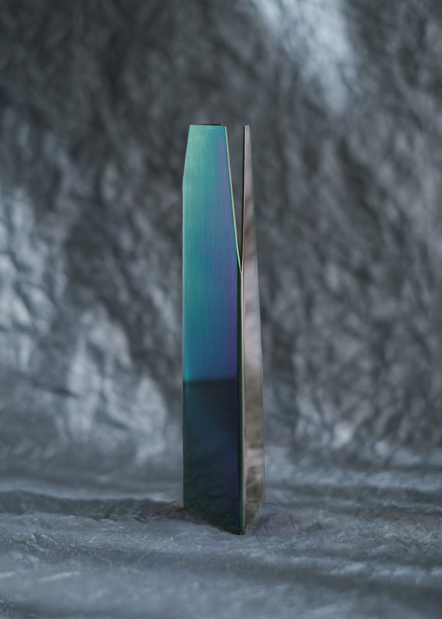 ・光の干渉現象を利用した光100%の色彩が特徴の酸化発色を施し、輝く玉虫色を表現