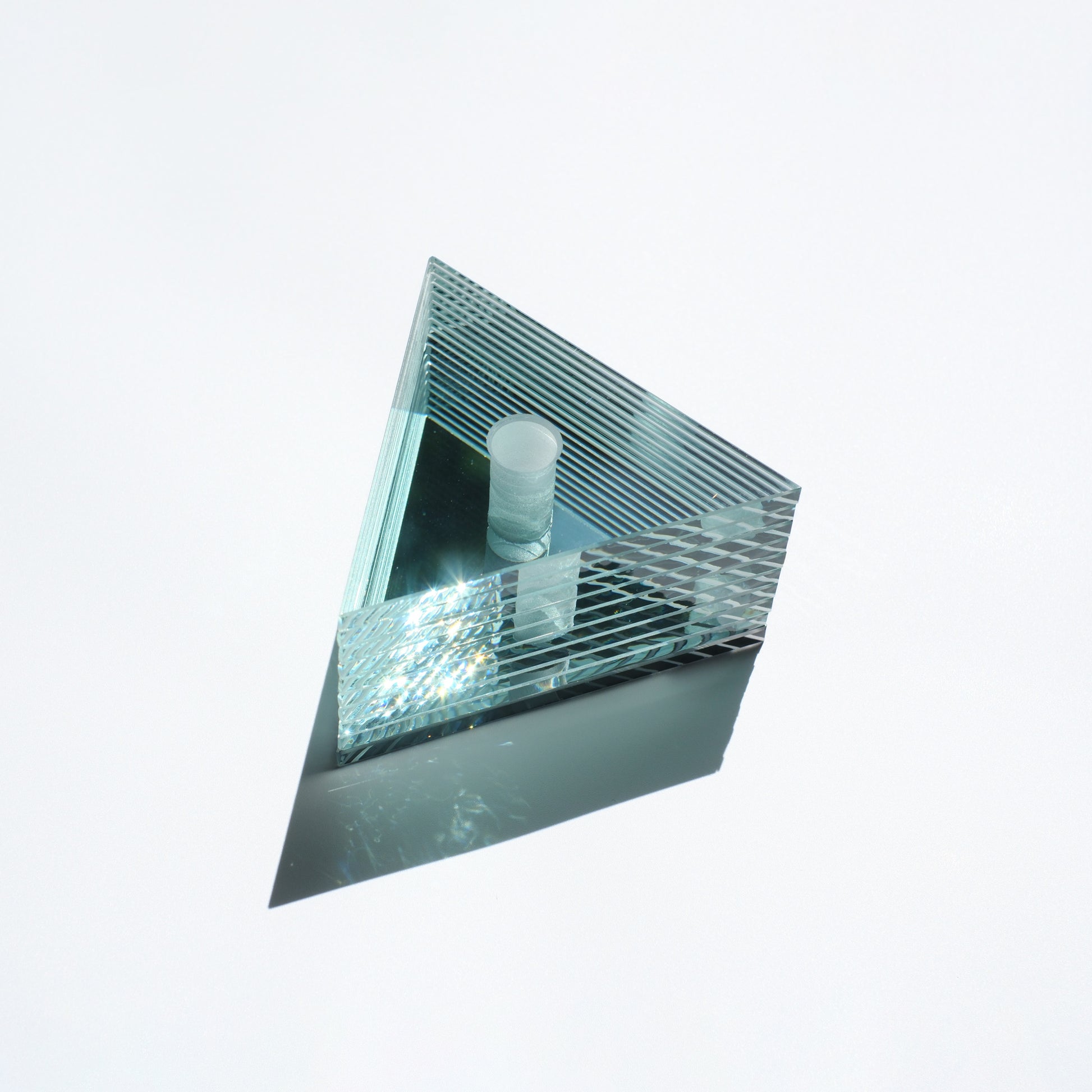 手作業で一枚づつ切断されたガラスのランダムな断面を通した光は、独特な揺らぎを表現しています。底面にダークミラーを埋め込むことで、生けた植物が多層ガラスの奥底に薄暗く反射し、様々な角度で花生けをお楽しみいただけます。素材に窓ガラスや光学ガラスの端材を活用し、アップサイクルを実現しています。